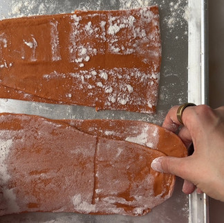 once the 4 dough pieces are fully rolled out, you can shape it into your desired pasta shape using the attachments on your pasta machine. separate and lightly flour your strands so they don’t stick together !!! if you don't have a machine, you can essentially just use a rolling pin to bring it down to your desired thickness and then fold and cut. there are many tutorials online.