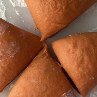 after resting, cut the dough into quarters. flour your work surface and a rolling pin. take one piece of dough and flatten it slightly with your hands and roll into an oval shape.